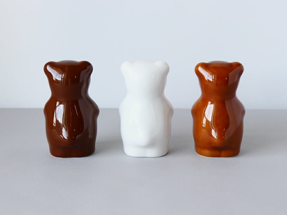 金善製陶所とのコラボレーションで生まれた2色は、どちらもやさしい色合いととろみのある質感が魅力。丁寧な「釉薬がけ」で仕上げられた、こだわりのカラーです。メープルシロップのようなあたたかみのある色合い。とろりとした質感が、ベアのフォルムをより愛らしく見せてくれます。