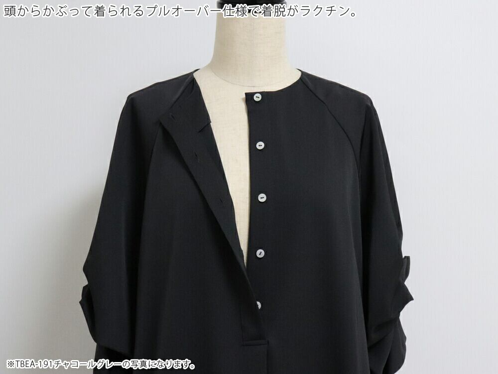 頭からかぶって着られるプルオーバーデザインに、ボタンを表に出さない比翼仕立てを採用。