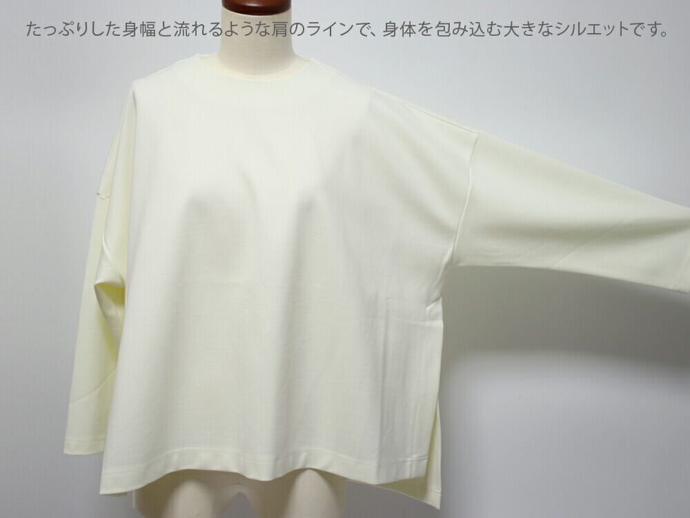 生地には、毛羽の少ないコンパクトヤーンを使用したストレッチポンチ素材を採用。ジャージー素材の一種で、ハリがあり丈夫なのが魅力です。一般的なカットソー素材よりもツヤ感や落ち感があり、なめらかな風合いが肌に優しく、心地よい着心地です。シワになりにくく、型くずれしにくいのも◎。日常使いにも最適です。