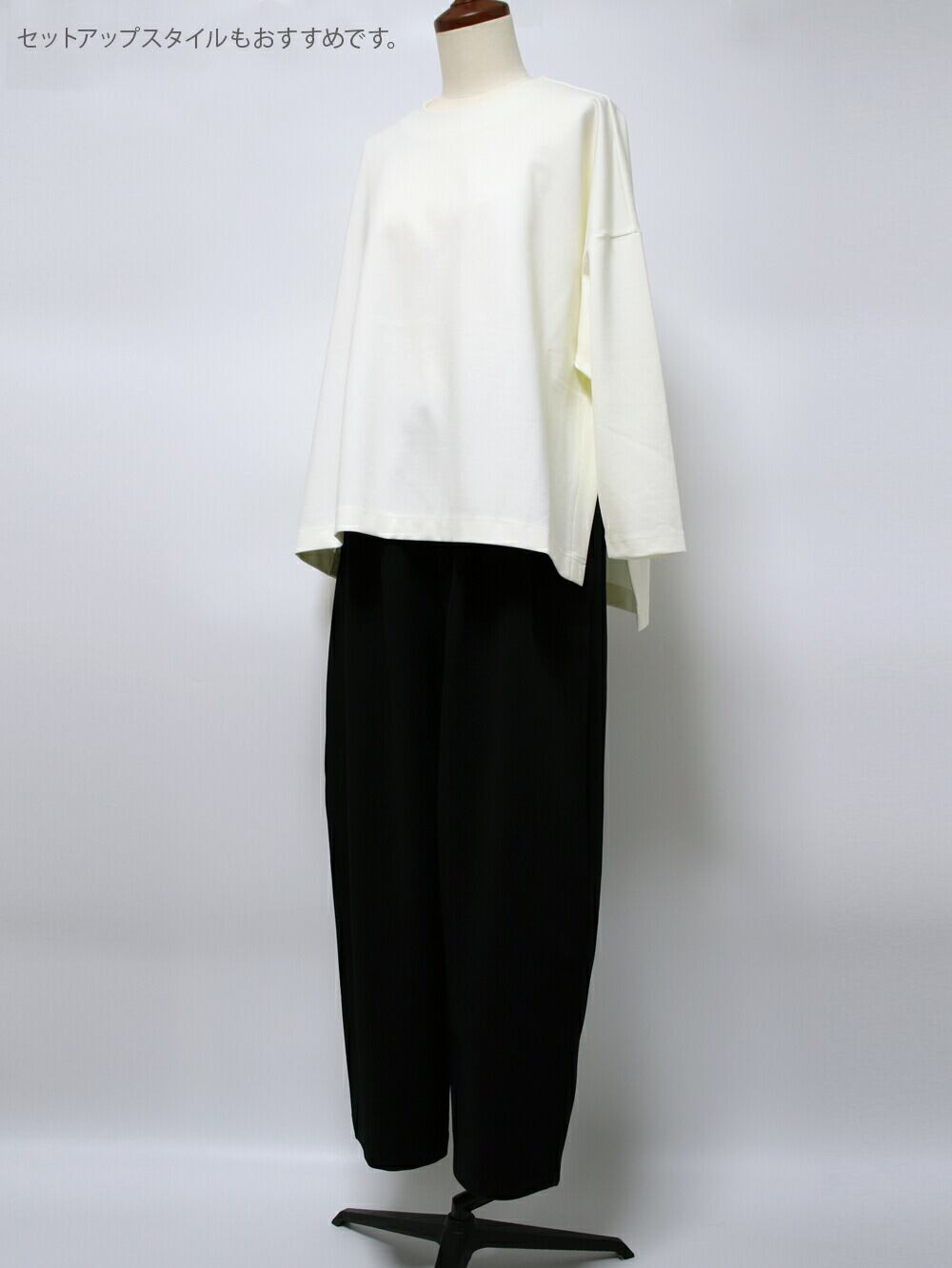 首元はフィット感がありながら、身体のラインを拾わないワイドシルエットで、裾に向かってゆるやかに広がるAラインが特徴です。ストレッチ性が高く、動きやすくて快適な着心地でありながら、上品で大人にふさわしい仕上がりとなっています。
