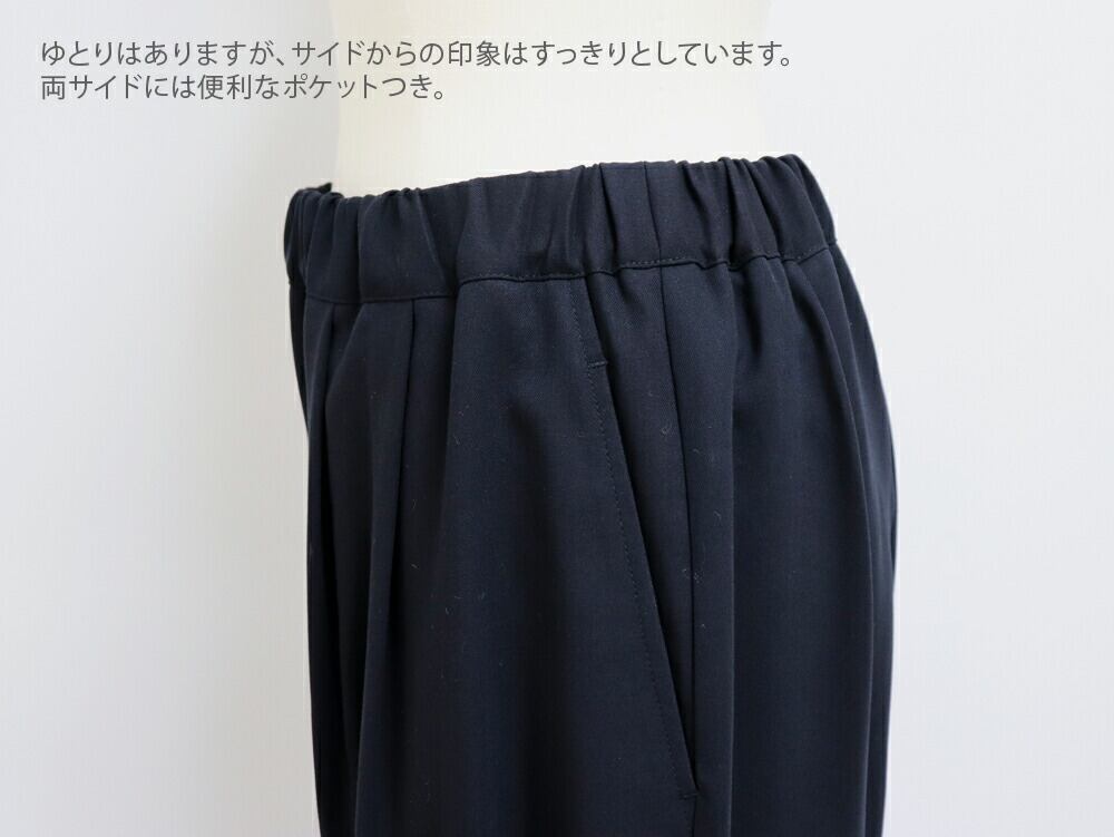 股上が深めで、ウエスト両サイドに2本ずつタックを入れることで、腰まわりにゆとりをもたせたリラックス感のあるはき心地。ヒップラインは自然な立体感がありながら、膝から裾に向かって細くなるテーパードシルエットが、すっきりとした印象に仕上げてくれます。