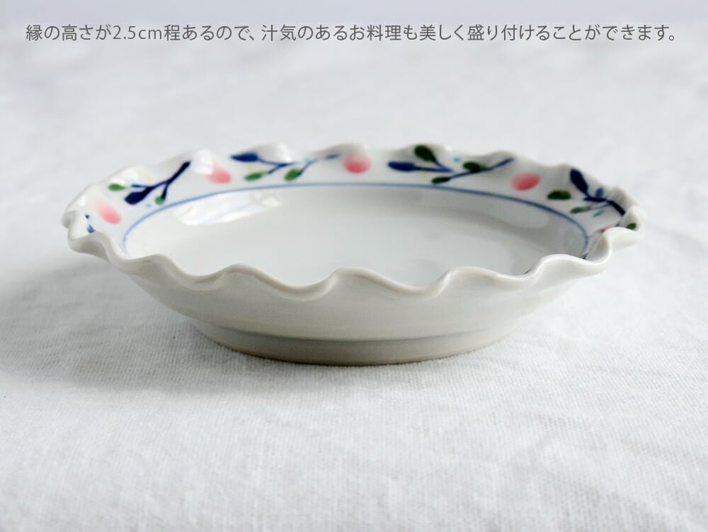 こちらは、やさしいピンク色の山桃の実と、緑や青の葉が描かれた、直径13.5cm(約4.5寸)のフリル皿。縁には約2.5cmの高さがあり、汁気のあるお料理もしっかりと受け止めて、美しく盛り付けることができます。取り皿にもぴったりな大きさで、副菜やおやつをのせて、食卓を彩ってくれる一皿です。