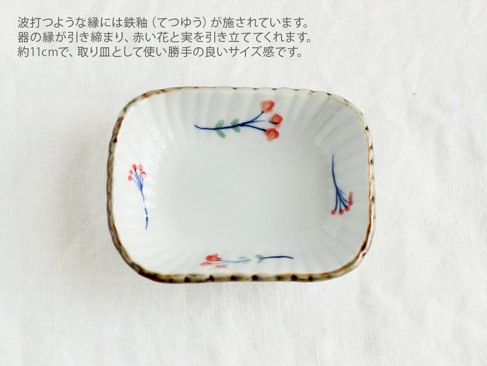 こちらは、赤い花と実が描かれた11cm(約4寸)の長角皿。縁に施された鉄釉(てつゆう/焼成することで黒や焦げ茶色に発色させる技法)により全体が引き締まり、赤い花と実の鮮やかさを引き立ててくれます。