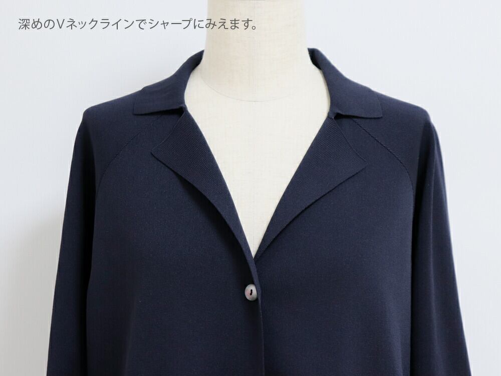 深めのVネックが顔まわりをすっきりと見せ、さまざまなインナーと合わせやすいデザインです。気軽に羽織れて、1枚あると重宝します。