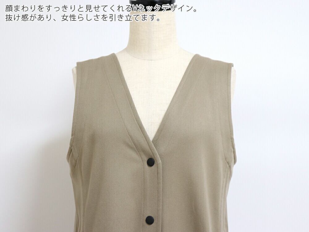 ワンピースとしてだけではなく、フロントボタンをすべて開ければ、ジレ(ロングベスト)としての着用も可能。