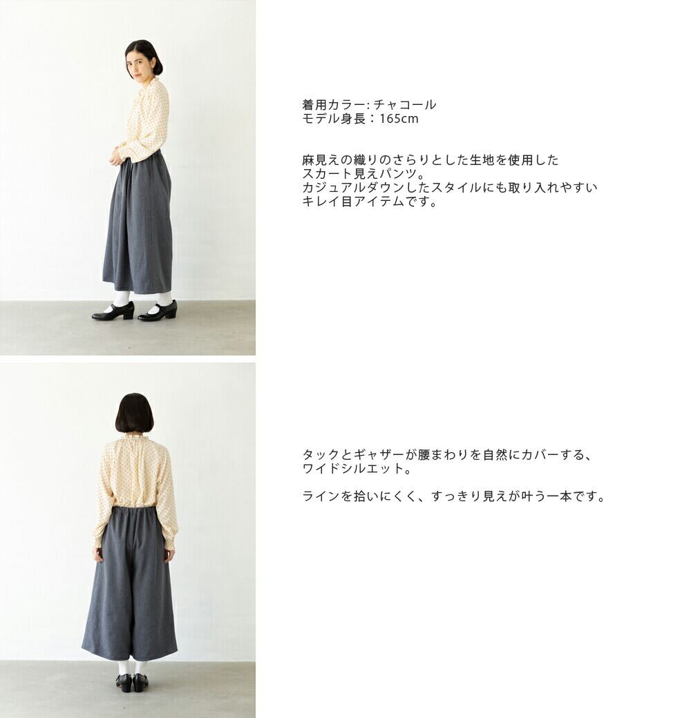 スカートのような上品さと、パンツならではの動きやすさを兼ね備えた、きれい見えとラクさを両立する一本です。
