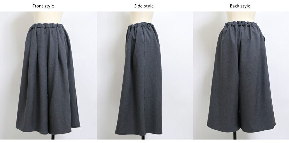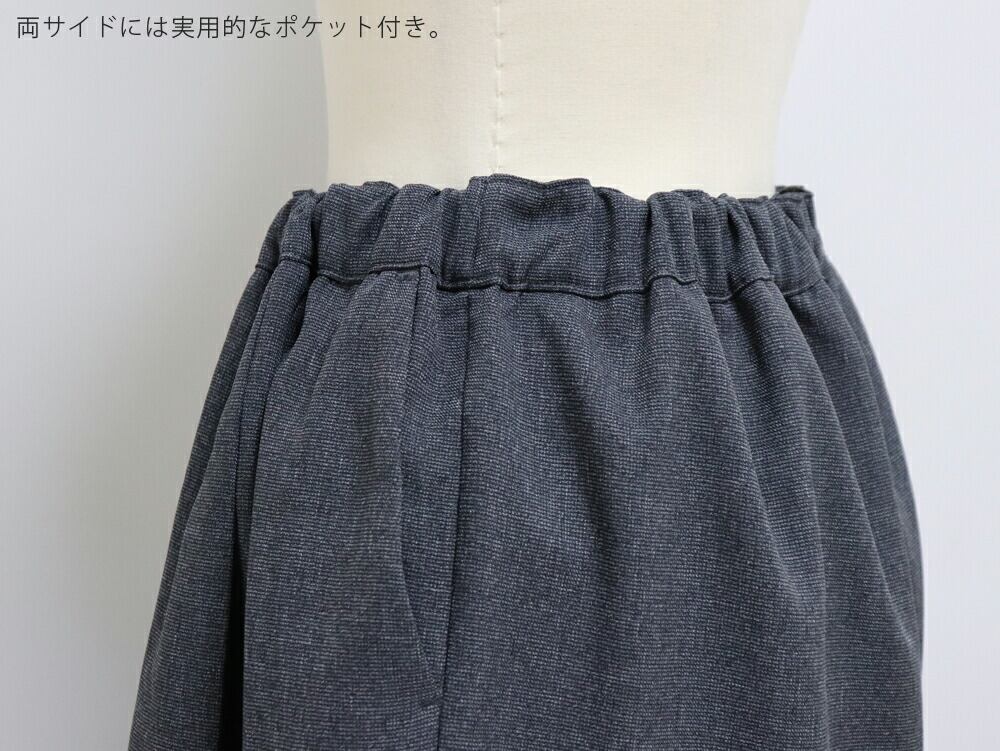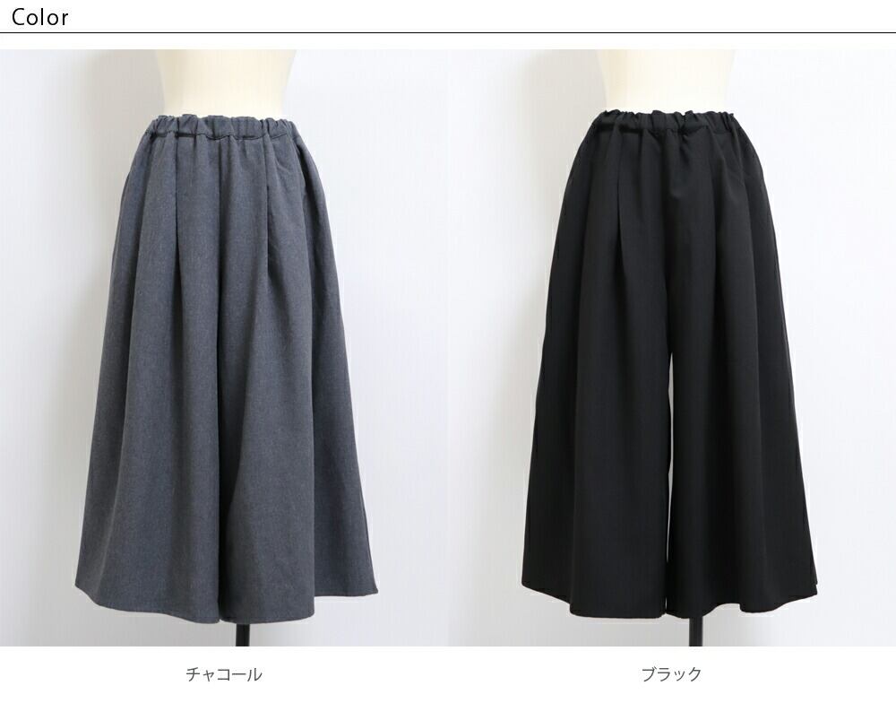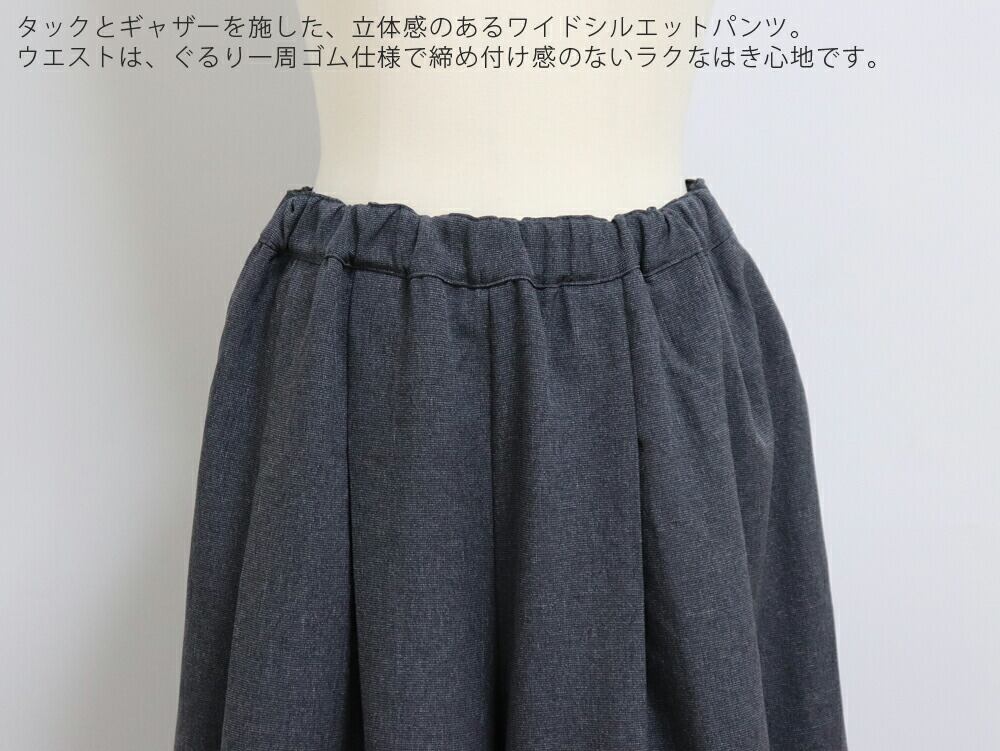 タックとギャザーを入れたワイドシルエットで、腰まわりや脚のラインを自然にカバー。