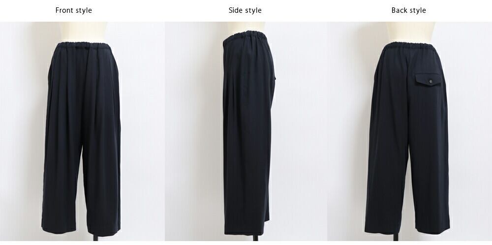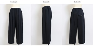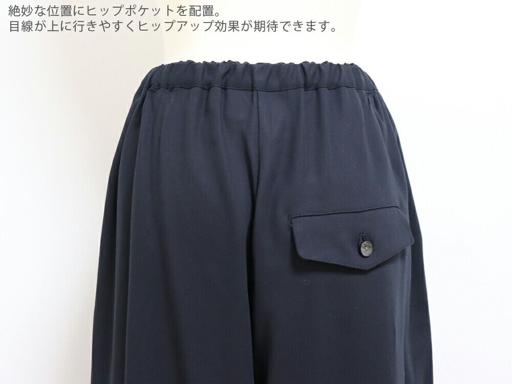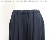 たっぷりとタックを施し、気になる腰回りをカバー。広がりすぎないデザインで、全体はすっきりとした印象に仕上げています。