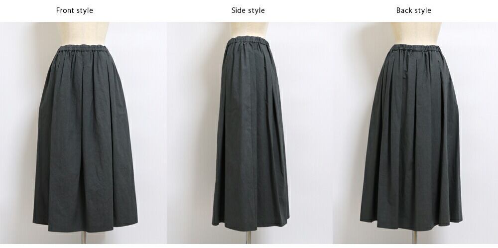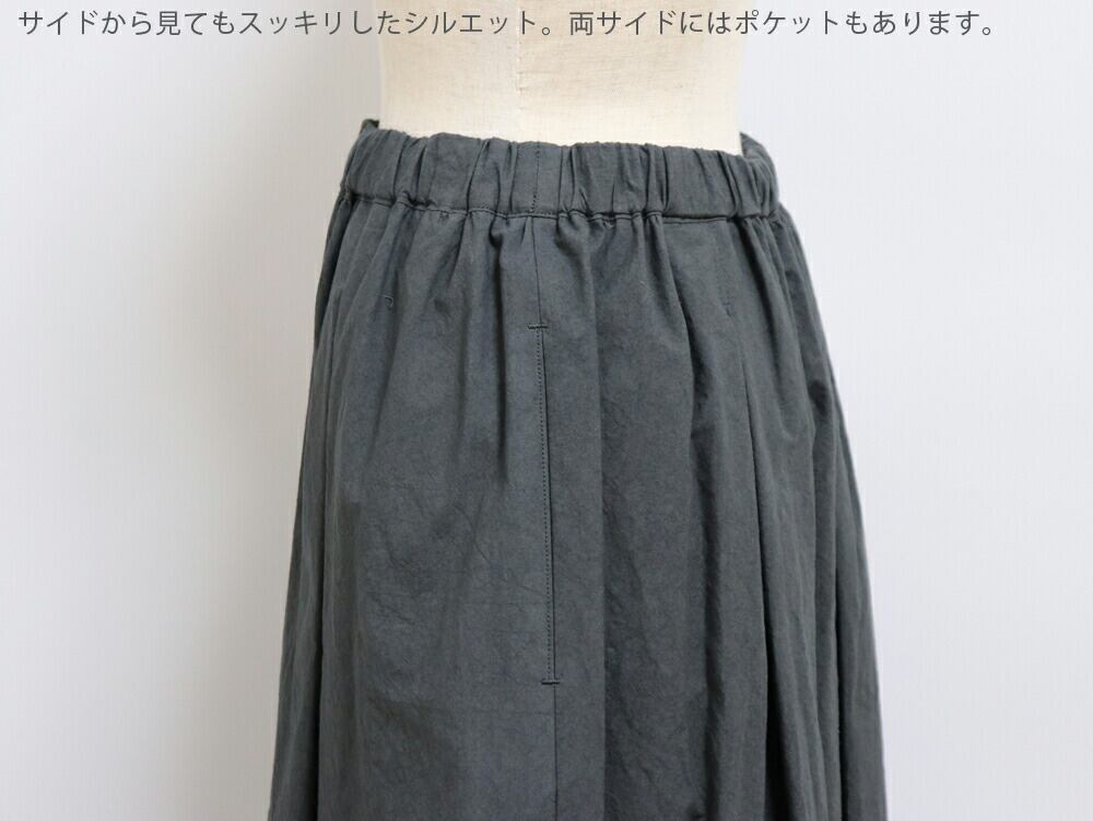 たっぷりと入れたギャザーが腰まわりをやさしく包み込み、体のラインを拾わず、すっきりと見せてくれます。