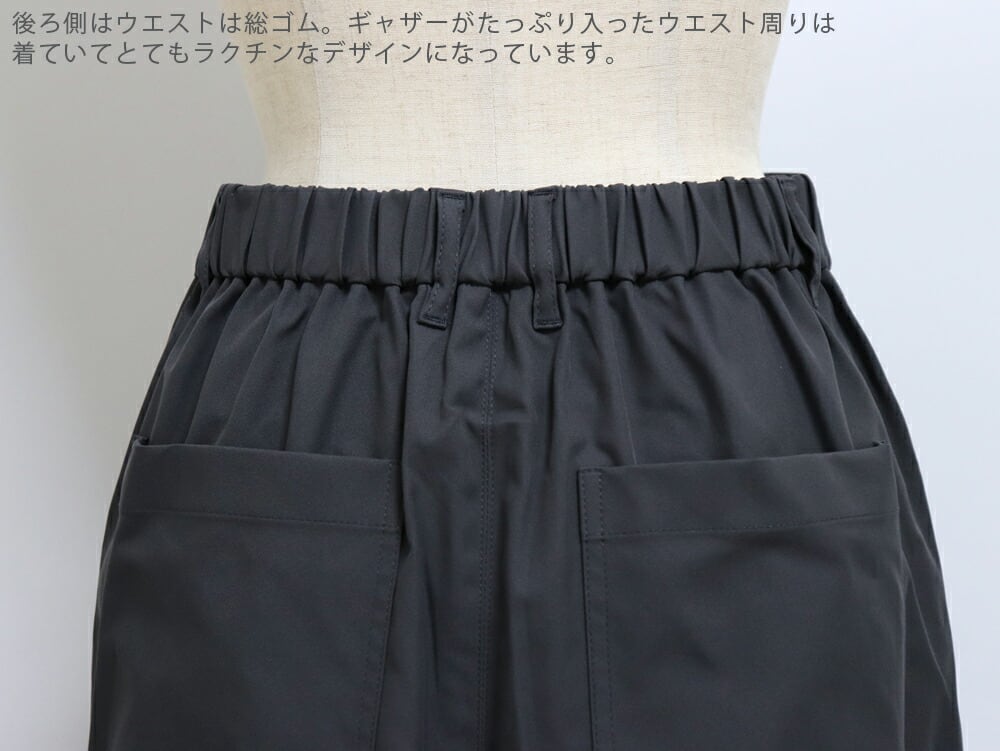 後ろウエストは総ゴム仕様で、ギャザーをたっぷり入れることで締め付け感が少なく、リラックスした穿き心地に仕上げています。