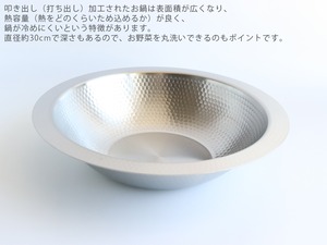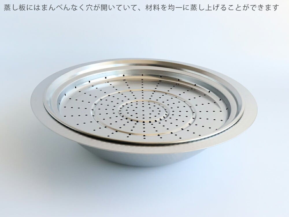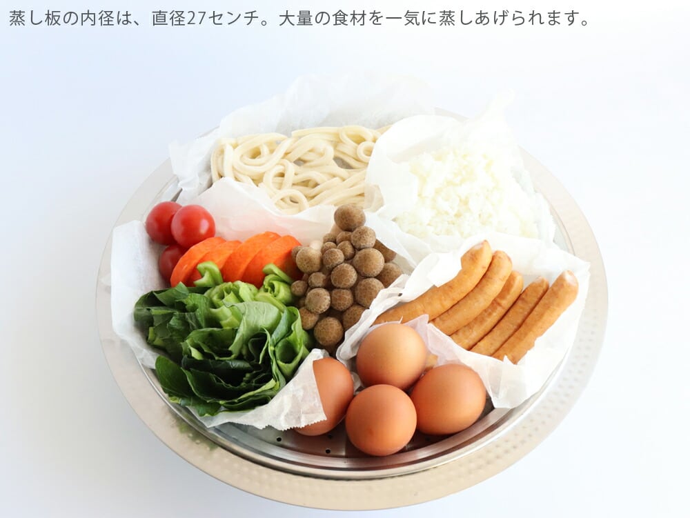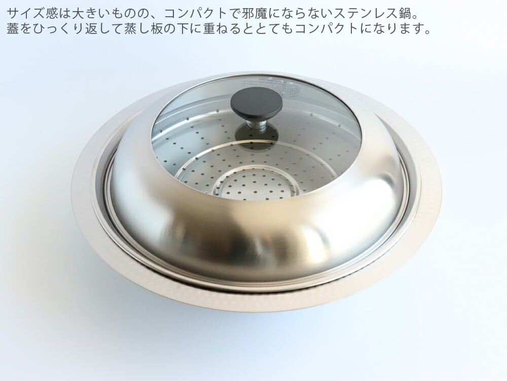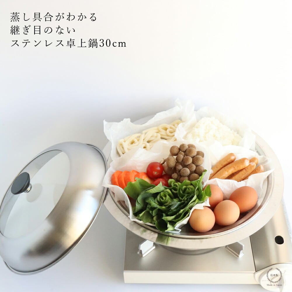 蒸し具合がわかる 継ぎ目のないステンレス卓上鍋 30cm 蒸し皿付き