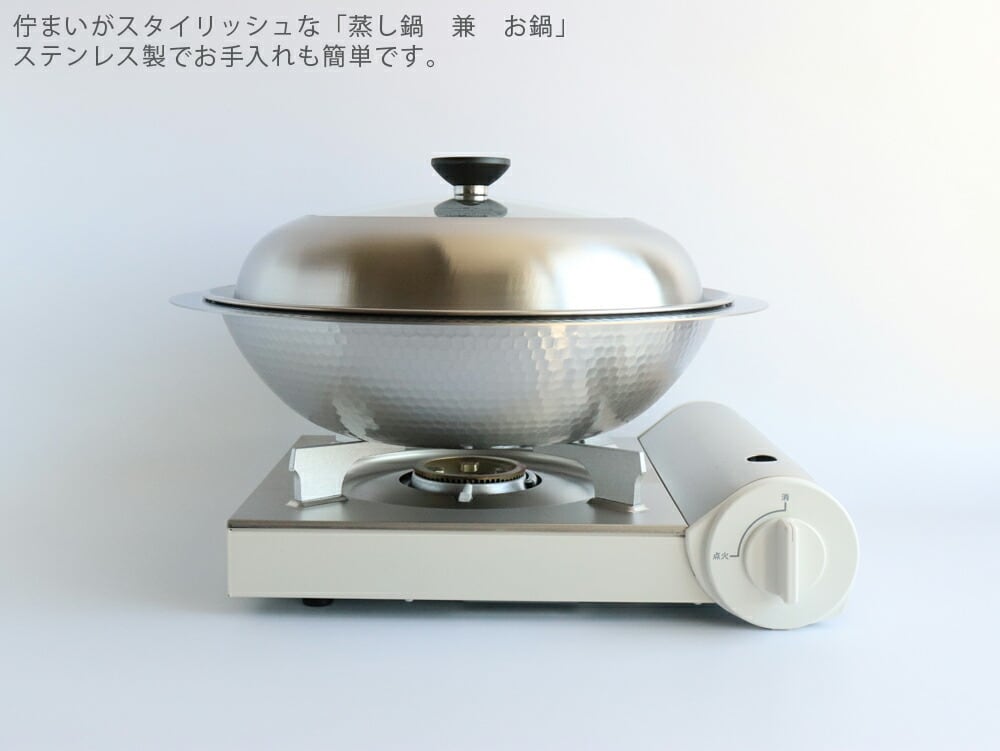 シンプルで洗練されたデザインのステンレス卓上鍋に、便利な蒸し器をセット。
