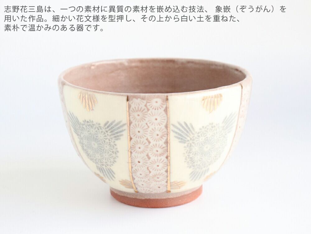 こちらは、やわらかな色合いに繊細な花文様と金彩が映える志野花三島の抹茶碗です。