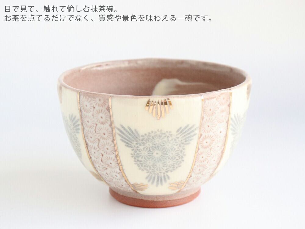 細かい花の文様と金彩が施された華やかな抹茶碗