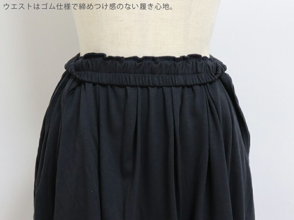 ウエストがゴム仕様なので、長時間着ていてもストレスフリーです。両サイドには便利なポケットが付き。