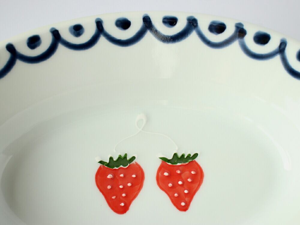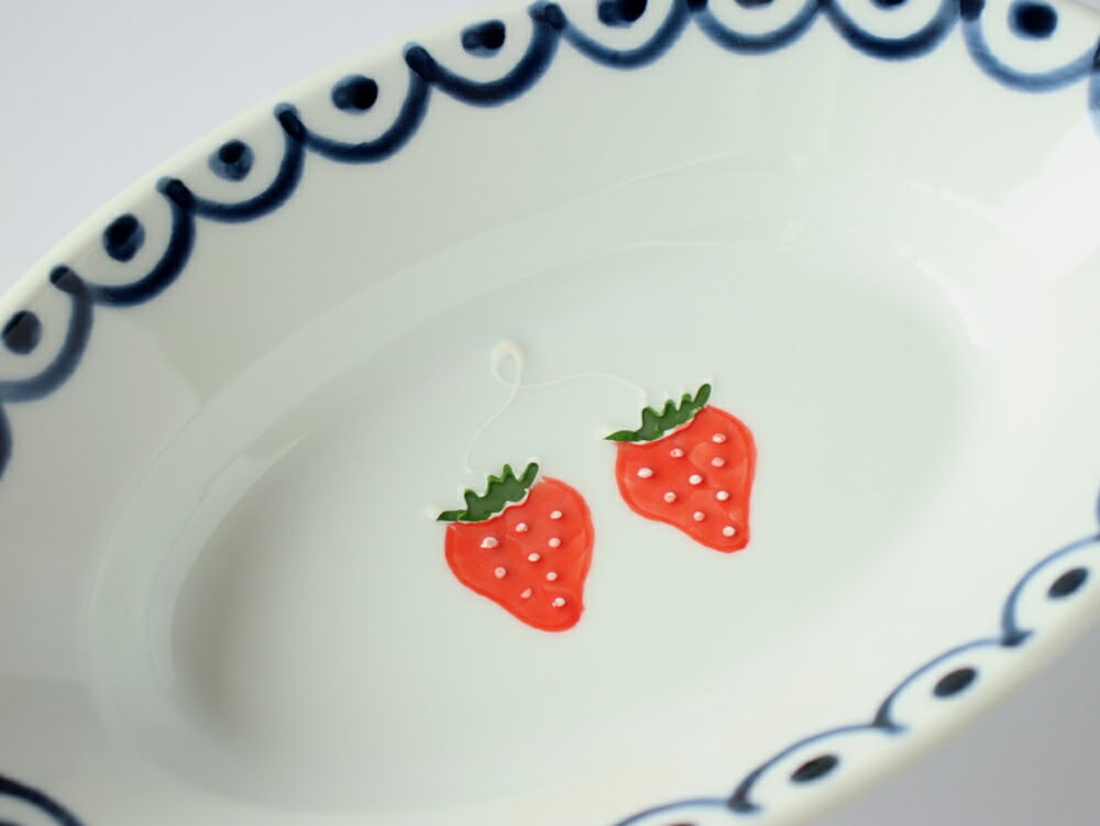 しのぎ模様に苺の絵柄 モダンでかわいらしい伊万里焼の楕円鉢