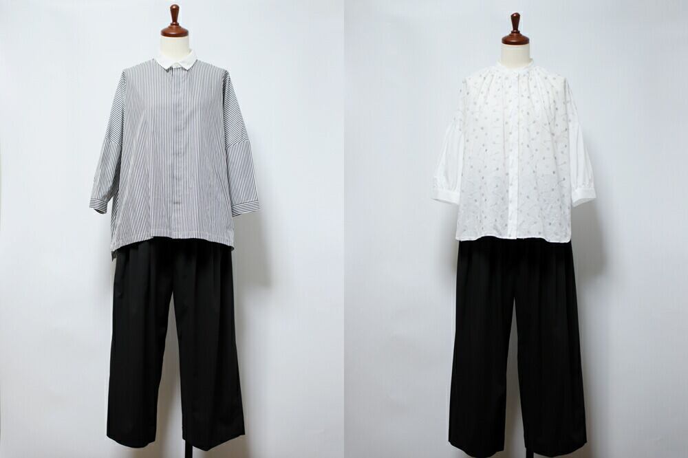 ウエストにタックが入っているので、腰回りはゆったりとしています。ヒップやわたり幅もゆとりがあり、ふんわりとしたシルエット。体のラインを拾いません。ウエストゴム&ストレッチも効いて着心地も楽ちん!肌離れがよくひんやりとしているので、暑くなる時期にも心地よく着られますよ♪
