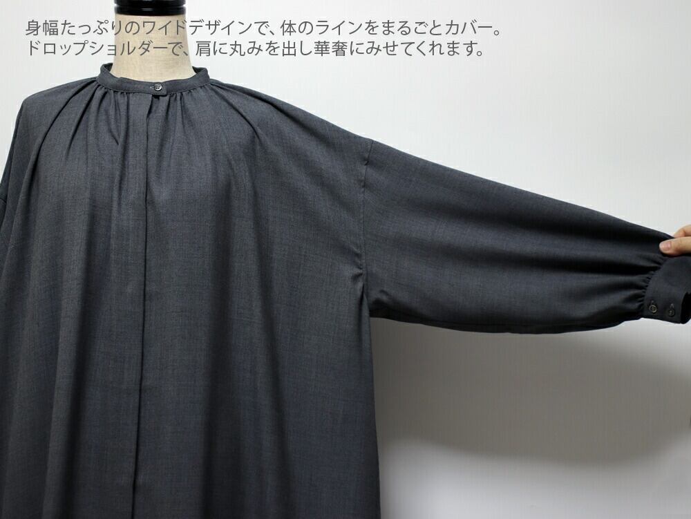 スタンプアンドダイアリー ポリエステルとウール混のしなやかな綾織素材 ふんわりとしたギャザーコートワンピース【日本製 洗える 送料無料 40代 50代 春 秋 冬 きれいめ おしゃれ 体型カバー 長袖 ドロップショルダー コン グレー STAMP AND DIARY】