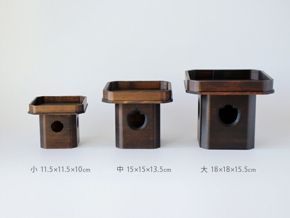 三宝には国産の木曽檜を使用。漆を塗ってあるので引き締まり、鏡餅をキリッと引き立ててくれます。手作りで作られているため、どれもかすれや濃淡などの色むらがございます。ある意味1点ものですので出会いをお楽しみいただければと思います。